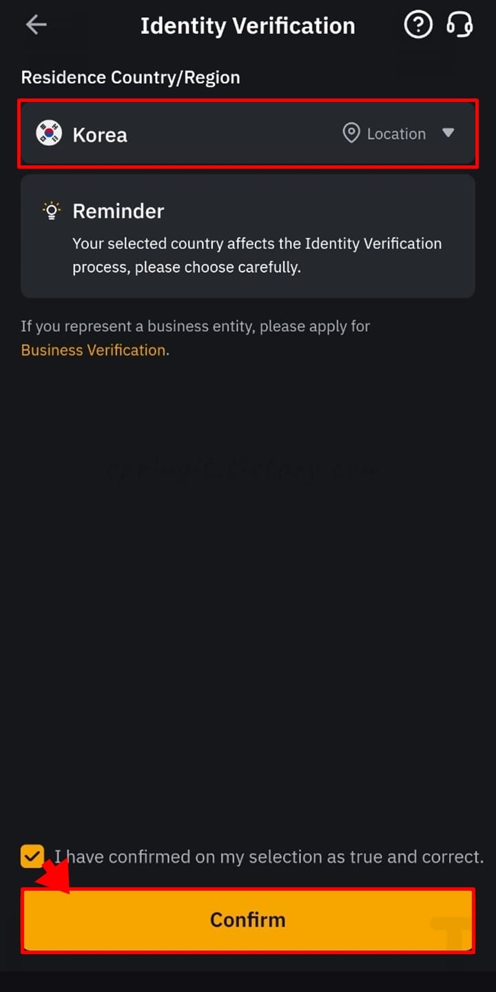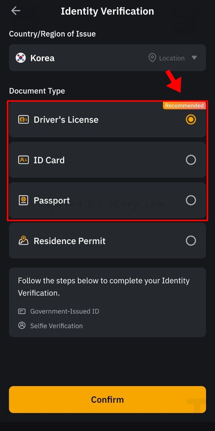 14. 인증에 사용할 신분증을 선택 후 Confirm을 클릭합니다.