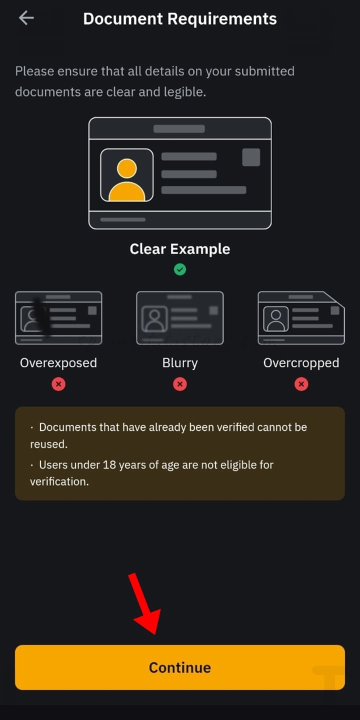 15. 신분증 촬영 안내 화면에서 Continue를 클릭합니다.