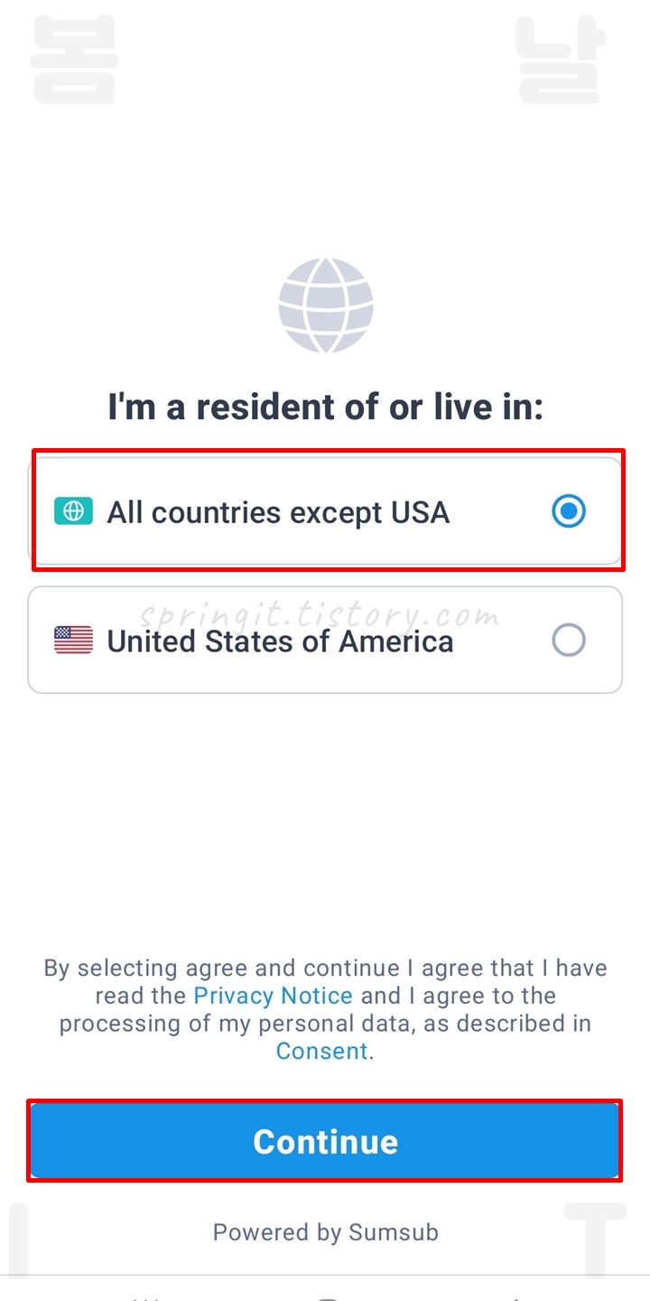 16. 다음 화면에서 All countries except USA를 선택 후 Continue를 누릅니다.
