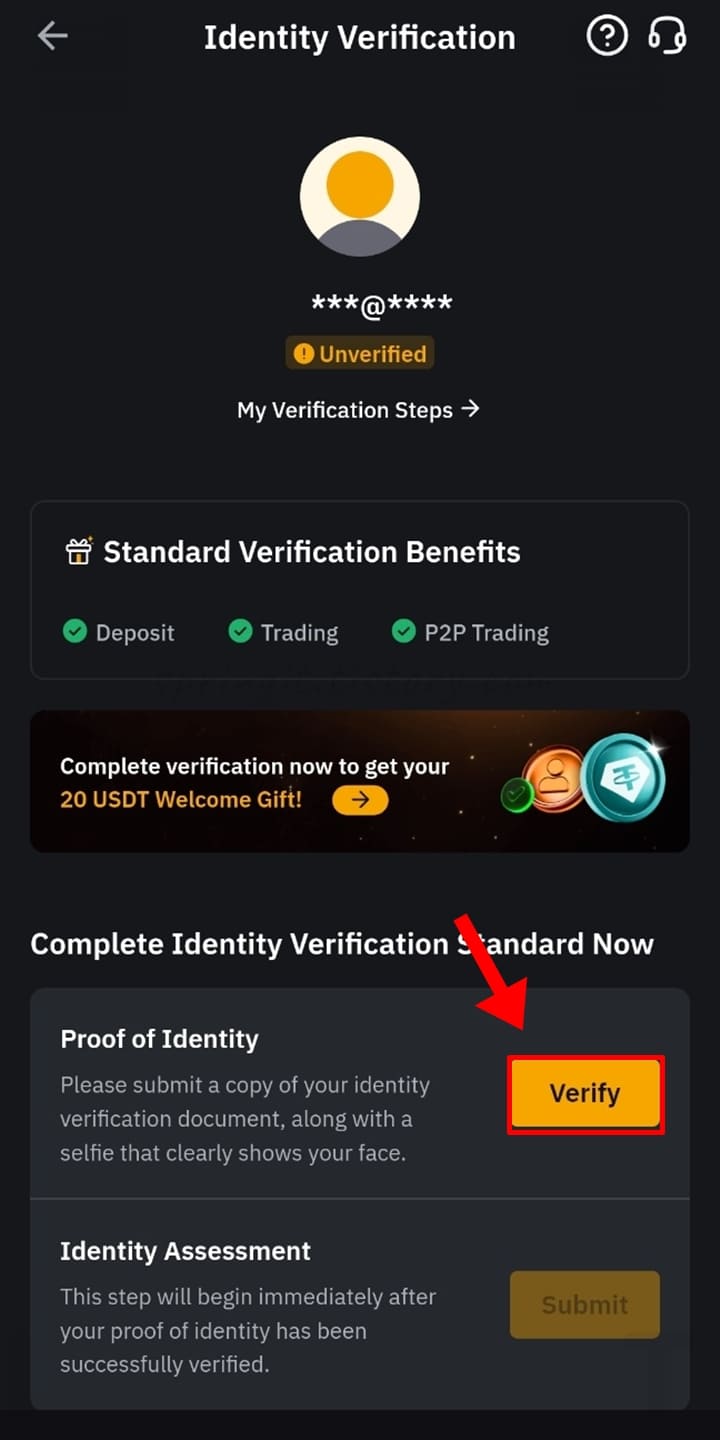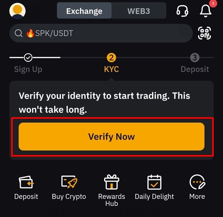 혹시 실수로 환영 화면을 닫으셨다면 바이비트 메인 홈 화면 위에 표시된 Verify Now 버튼을 눌러 KYC 인증 절차를 진행할 수 있습니다. 참고로 KYC 인증을 진행해야지만 입출금 및 현물/선물 거래가 가능해지는 만큼 바이비트 가입시 필수로 진행하셔야 합니다.