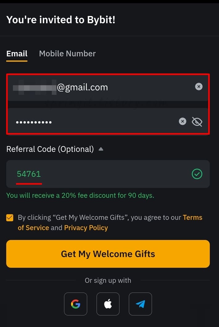 최대 혜택으로 새로운 부계정을 만들기 위해서 바이비트 가입 링크(클릭 접속)를 눌러 신규 가입을 진행합니다. 해당 링크로 접속하면 시중에서 가장 높은 수수료할인(20%)이 자동 적용됩니다. 다른 추천인 코드를 등록하면 이러한 혜택율이 낮거나 도중에 기간 만료가 될 수 있으니 공식 추천인 코드인 '54761'로 가입하셔야 합니다.