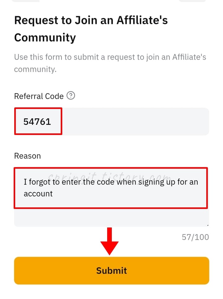 5. Submit를 클릭하면 바이비트 레퍼럴 변경 신청이 완료됩니다.
