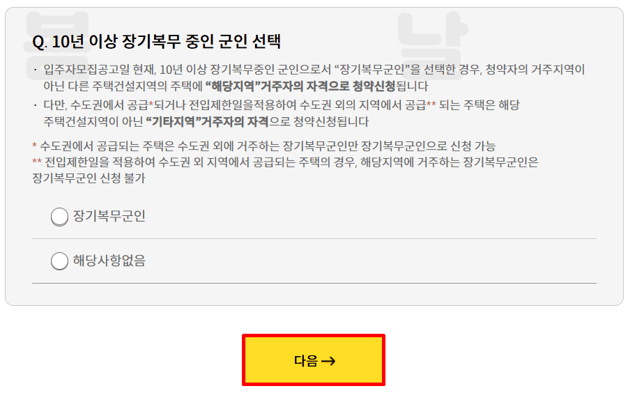 7. 복부 중 군인이 아니라면 해당사항없음을 선택하고 다음을 클릭합니다.