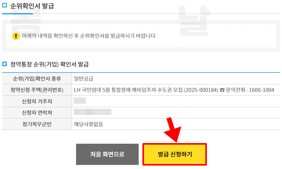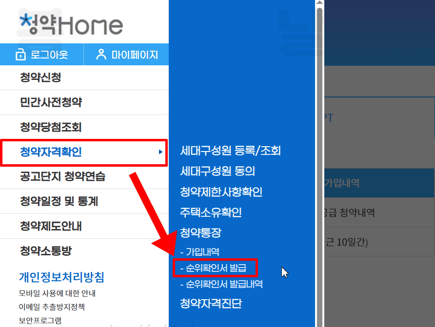 1. 청약홈 사이트에서 청약자격확인 > 순위확인서 발급을 누릅니다.