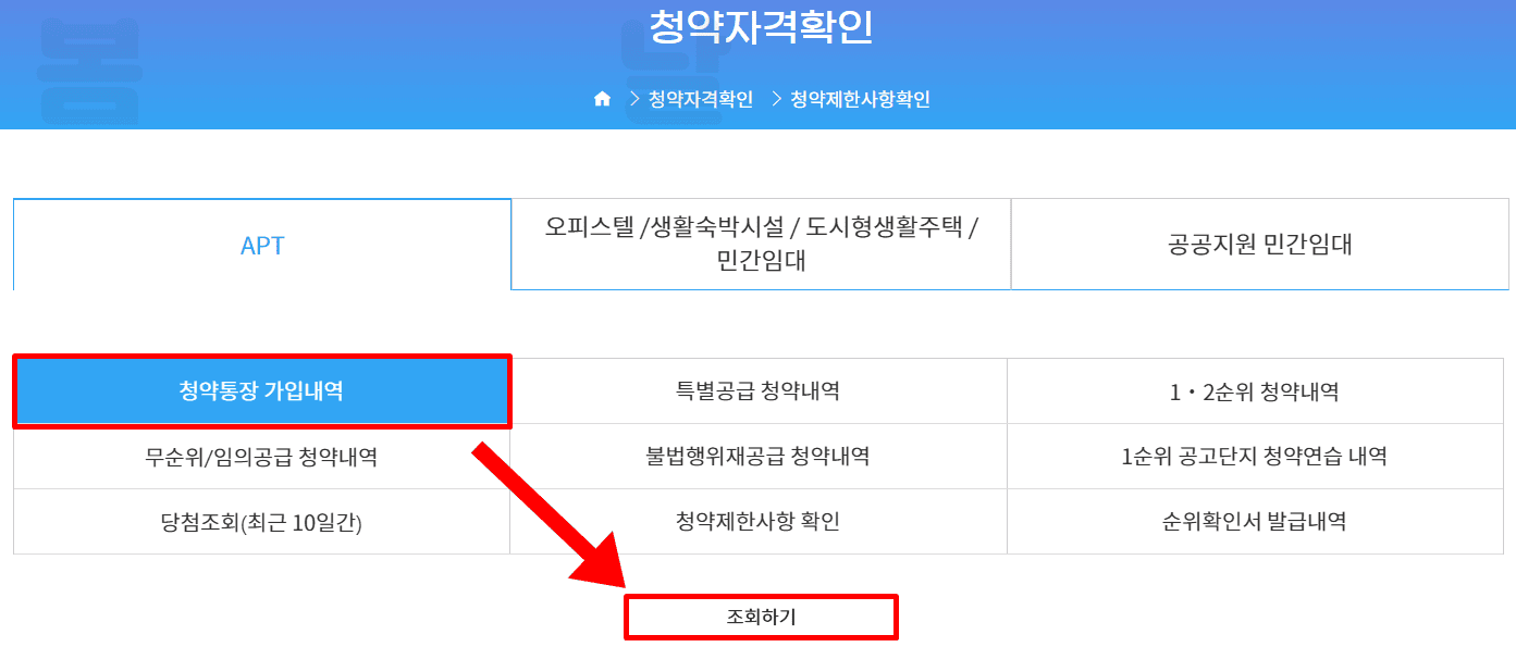 4. 청약통장 가입내역 > 조회하기를 누릅니다.