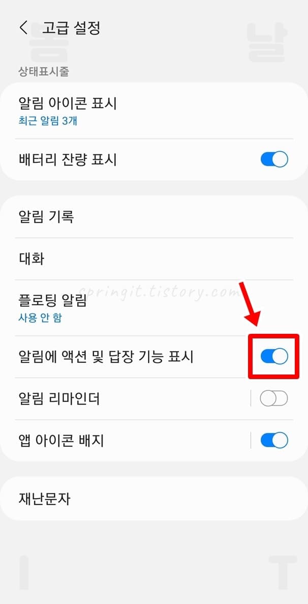 4. 알림에 액션 및 답장 기능 표시를 꺼주세요.