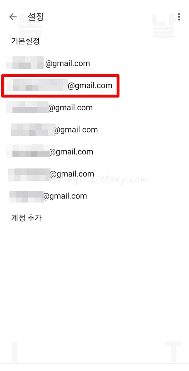 목록에서는 스마트폰에 저장된 모든 구글 계정 메일이 보여지는데요. 이곳에서 현재 gmail 로그인된 주계정을 선택해주시면 되겠습니다.
