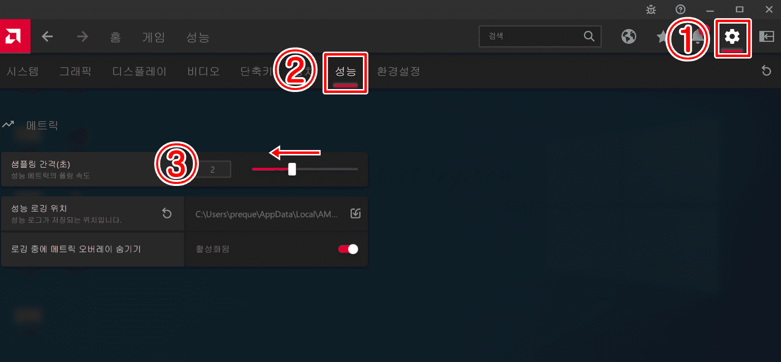 메트릭 샘플링 간격 또한 높을수록 노트북의 그래픽카드가 많이 사용되는데 이 수치를 낮춰주시면 팬 소음과 발열이 크게 감소됩니다. 제 노트북은 샘플링 간격이 2로 설정되어 있어서 1로 변경해주었습니다.