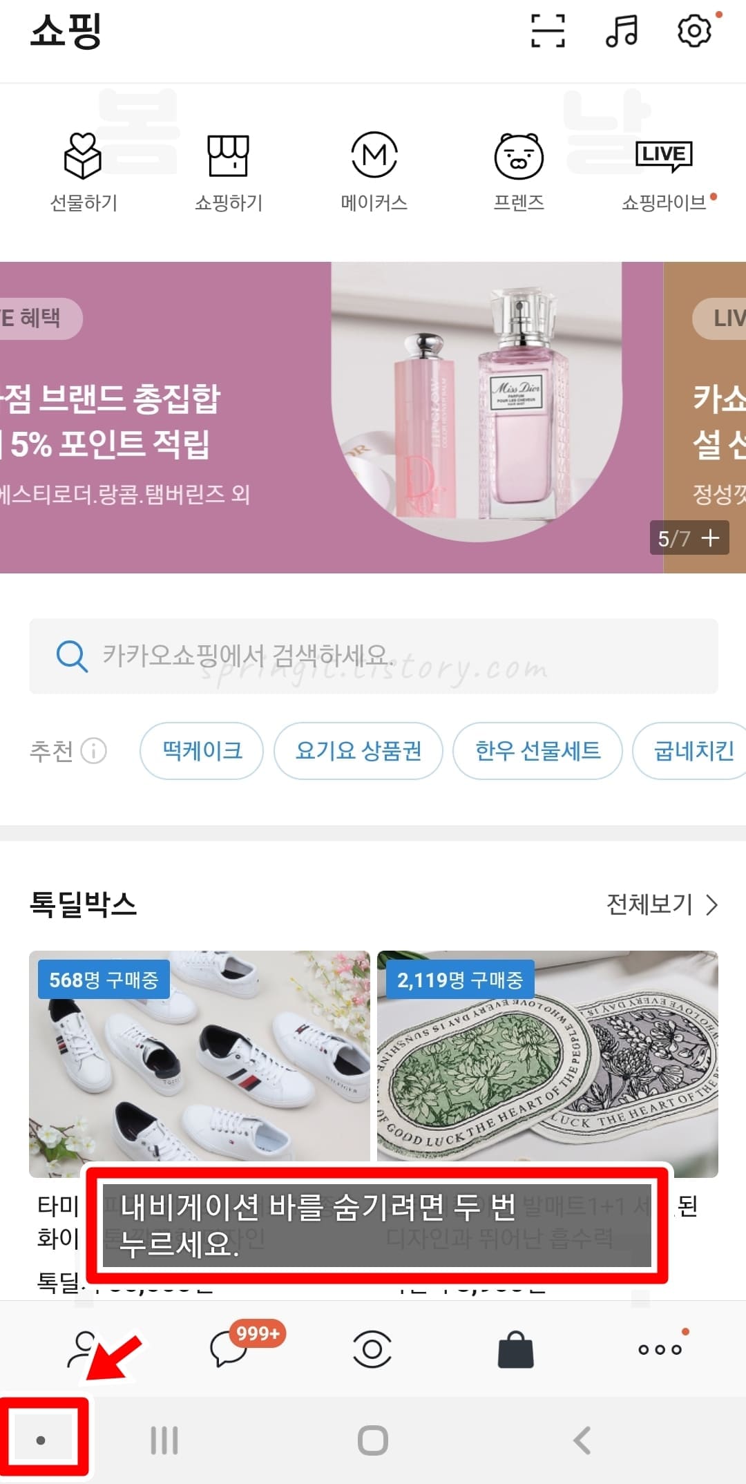 앱이 아닌 홈화면/앱스화면에서는 네비바가 표시됩니다. 만약 앱에서 투명하게 숨겨진 네비바를 다시 고정하고 싶다면 네비바 좌측의 점을 두번 누르면 해제됩니다. (설정과 해제 모두 점을 두번씩 누르면 변경 됨!)