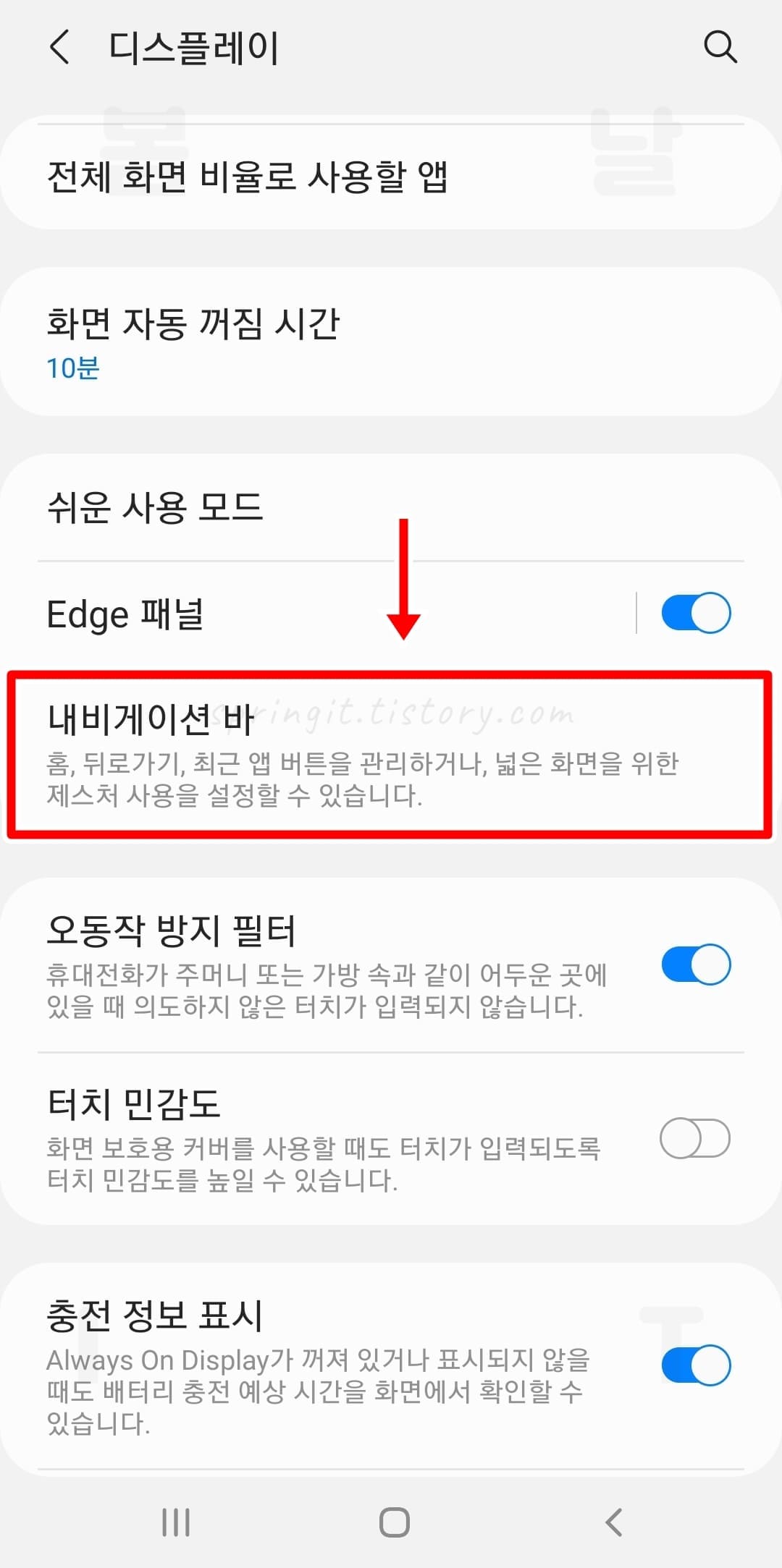 첫번째는 갤럭시 기본 설정에서 버튼 형식으로 계속 보여지는 하단 네비바를 스와이프 방식으로 변경해서 투명하게 숨기는 방법입니다. 가장 쉽고 빠르게 설정할 수 있어서 편리합니다.