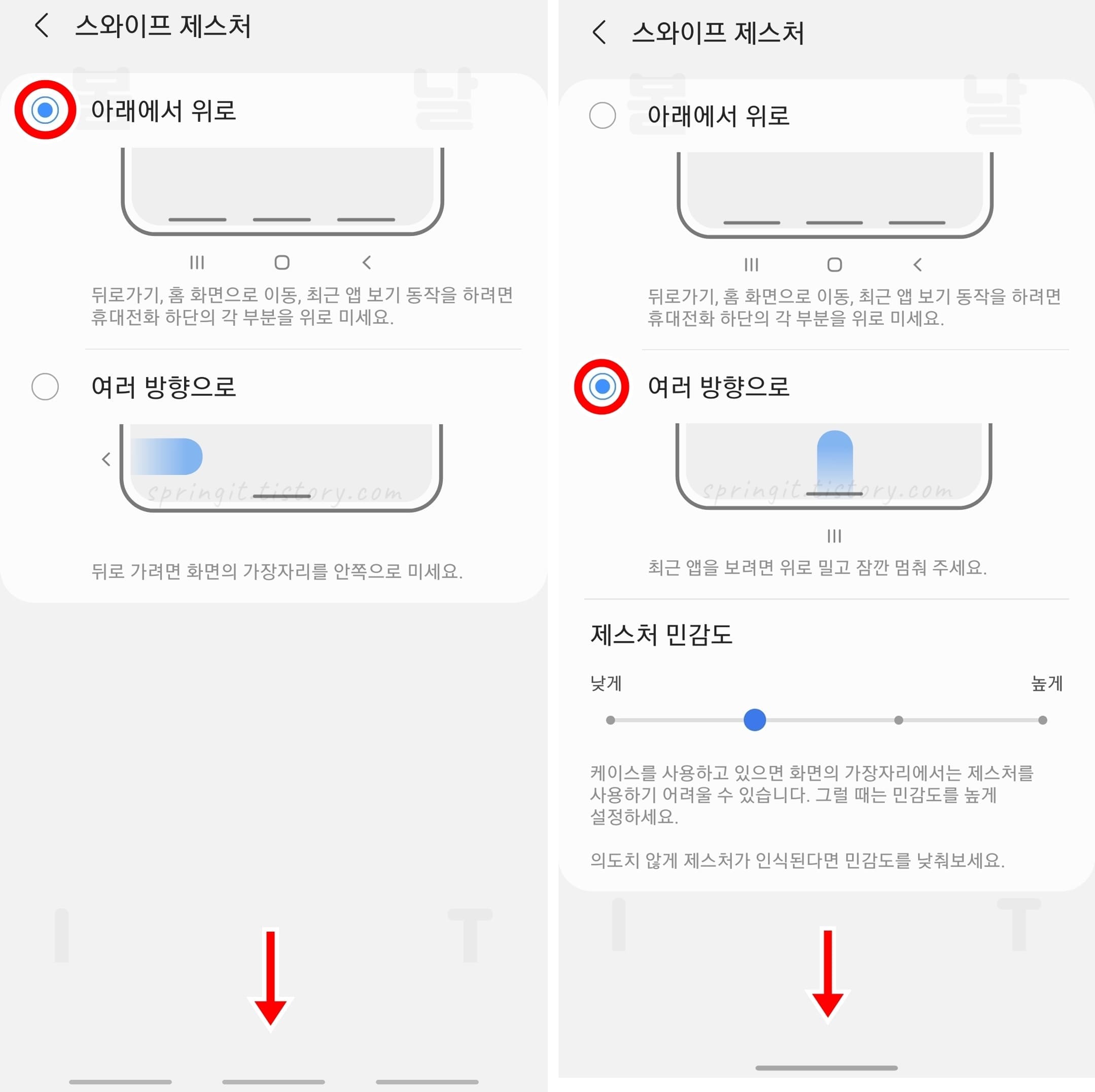 아래에서 위로: 기존 네비게이션바처럼 3개의 버튼을 아래에서 위로 밀어서 사용할 수 있습니다. 사진의 좌측으로 기존 네비바 버튼이 투명하게 숨겨지게 됩니다.