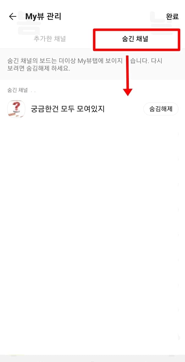 이렇게 숨겨진 채널은 my뷰관리 > 숨긴채널에서 확인할 수 있고 다시 숨김해제를 해줄 수 있습니다. 참고로 My뷰에 숨긴 채널의 보드는 표시되지 않으니 간단하게 채널을 관리해줄 수 있습니다.