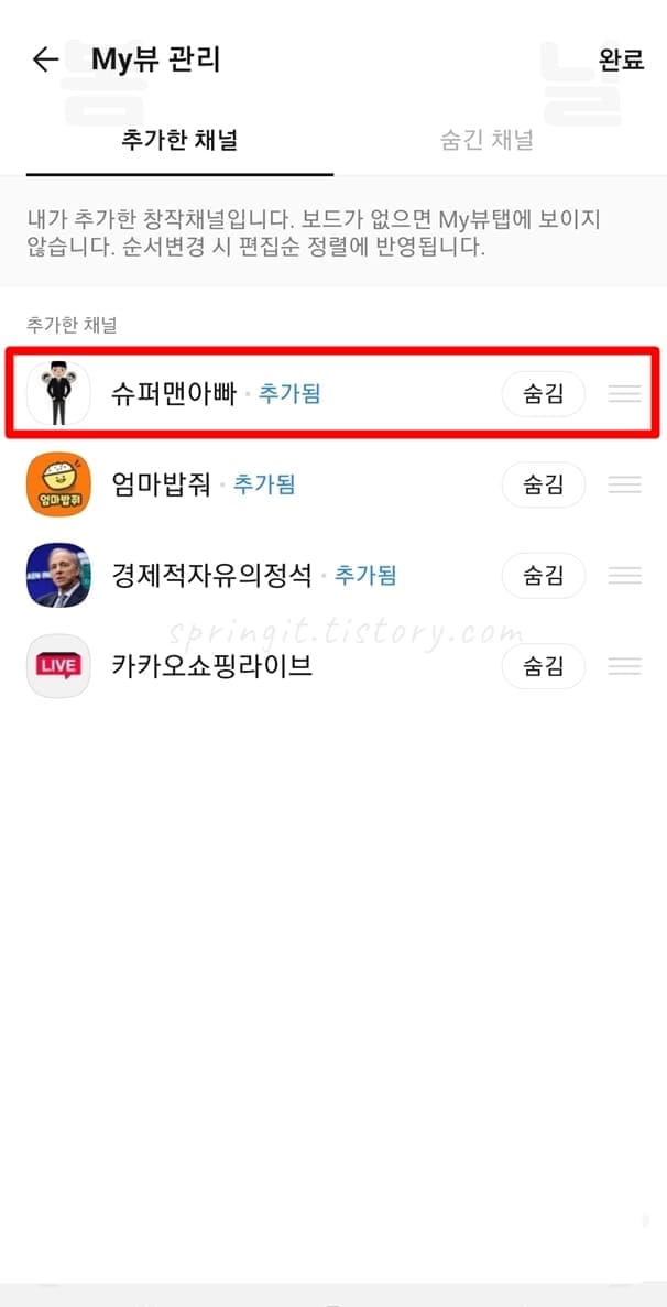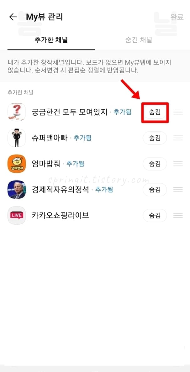 3. 마이뷰에서 보고 싶지 않은 채널의 우측 숨김을 클릭합니다.