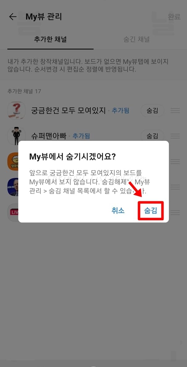 이렇게 숨겨진 채널은 my뷰관리 > 숨긴채널에서 확인할 수 있고 다시 숨김해제를 해줄 수 있습니다. 참고로 My뷰에 숨긴 채널의 보드는 표시되지 않으니 간단하게 채널을 관리해줄 수 있습니다.
