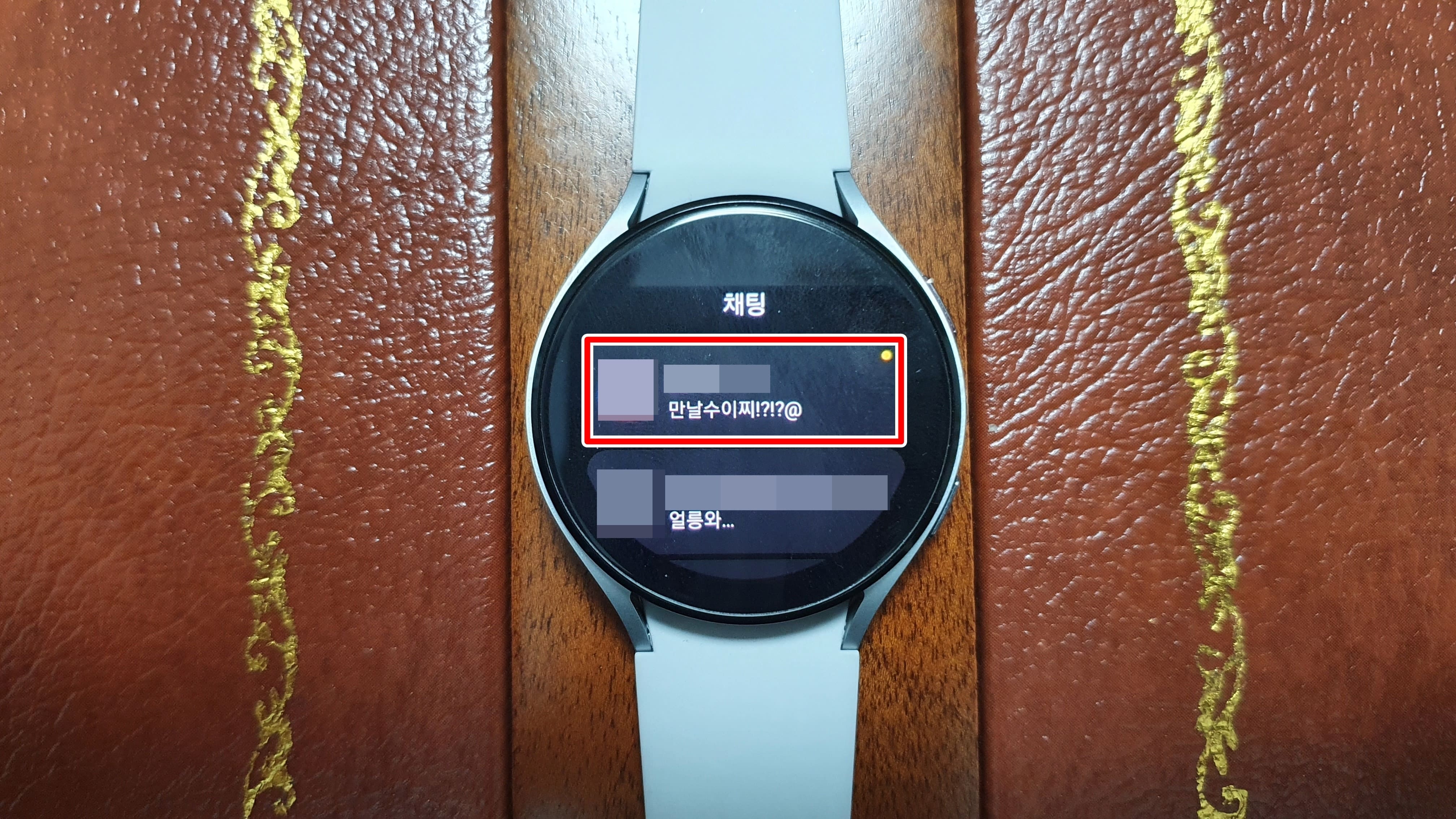 갤럭시 워치에서 카카오톡 앱을 켜주세요. 그러면 채팅방 목록이 보야지는데 보고싶은 방을 눌러서 들어갑니다.
