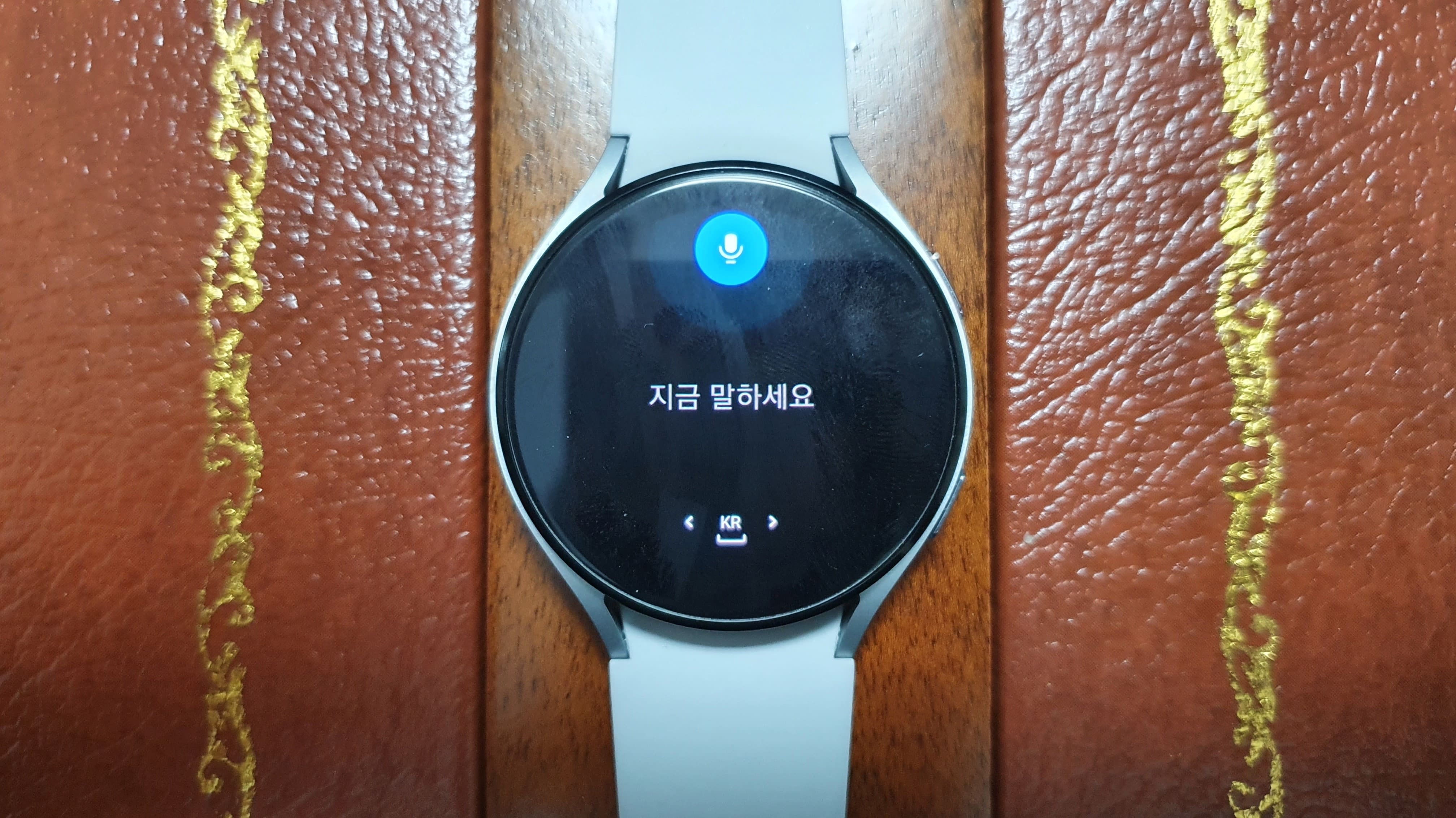 마이크모양 버튼을 누르면 곧바로 '지금 말하세요' 라는 화면을 볼 수 있습니다. 메시지로 보내고 싶은 말을 워치에 대고 말하시면 자동으로 인식해서 텍스트로 변환시켜줍니다.