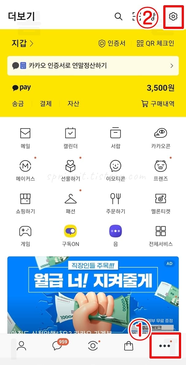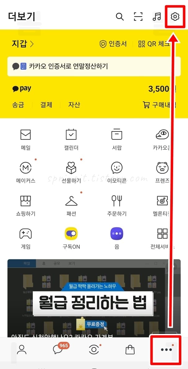 2. 더보기 탭을 누르고 톱니바퀴 설정을 클릭합니다.