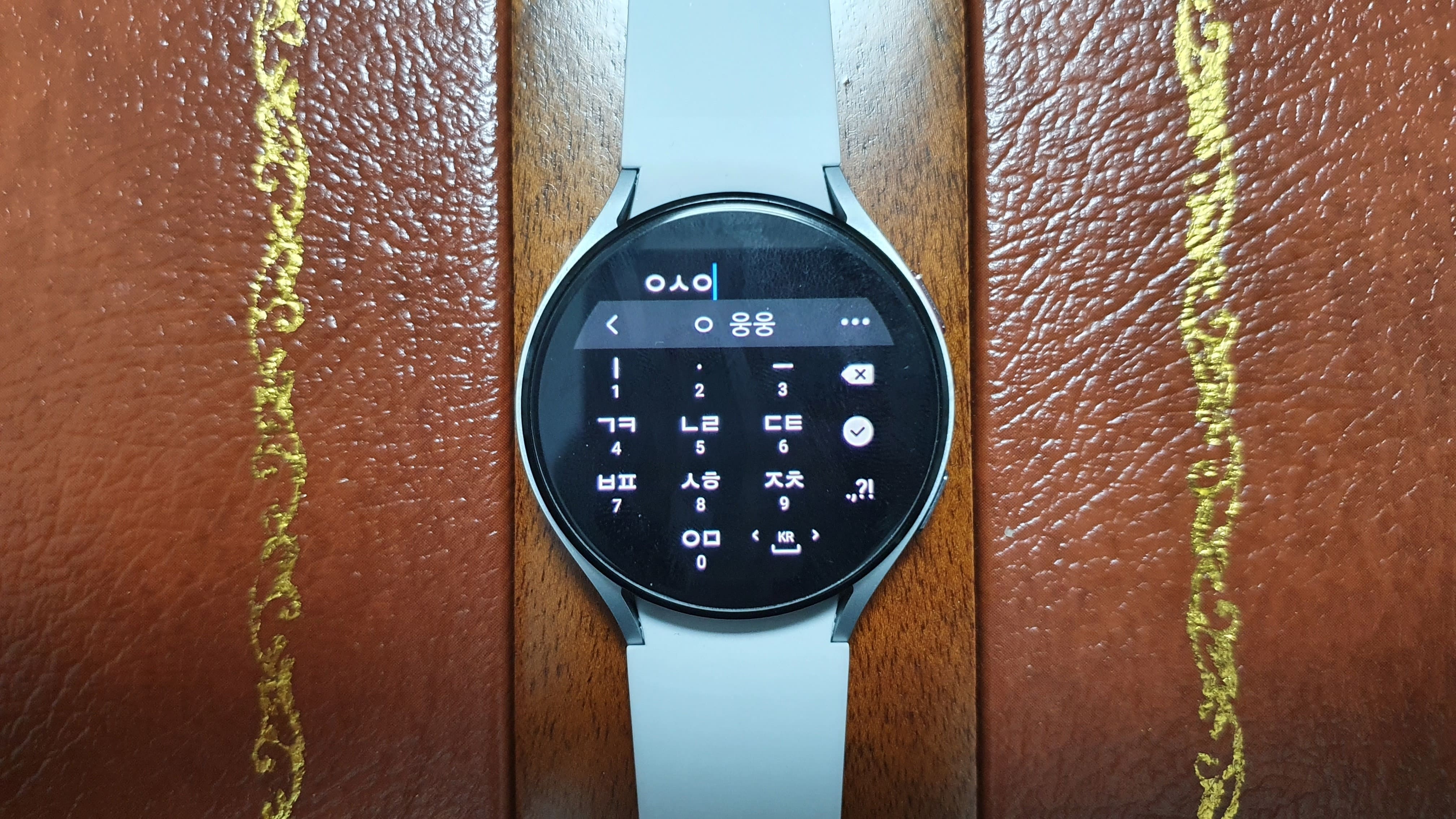 타이핑 키보드 버튼을 누르면 이렇게 워치에서 키패드가 뜨는데요. 한글, 영문, 특수문자를 모두 지원하니 입력에는 문제가 없으나 화면이 작은 편인지라 오타가 많이 발생하게 됩니다. 그래서 갤럭시 워치 카카오톡 사용시 크게 추천드리지는 않는 기능입니다.