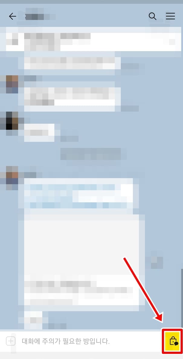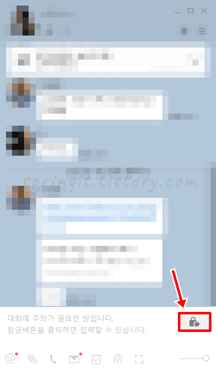 '대화에 주의가 필요한 방입니다.'가 입력창에 보이고 곧바로 메시지를 입력할 수 없는데요. 입력을 위해서는 입력창 우측의 잠금 해제 버튼을 클릭해야 합니다.