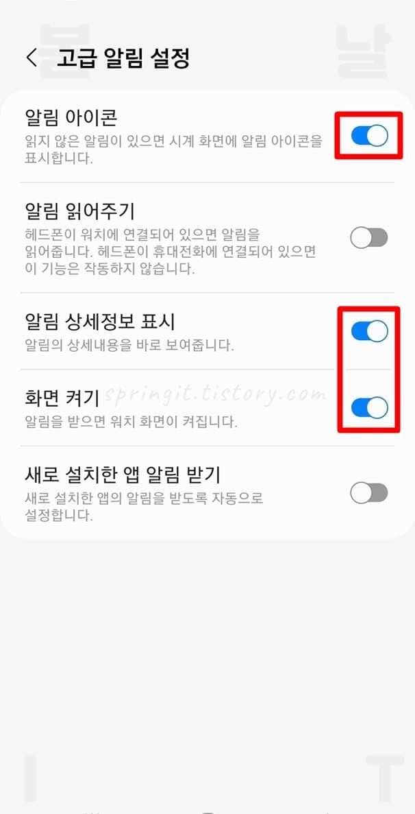 9. 알림 아이콘과 알림 상세정보 표시 및 화면 켜기를 활성화합니다.