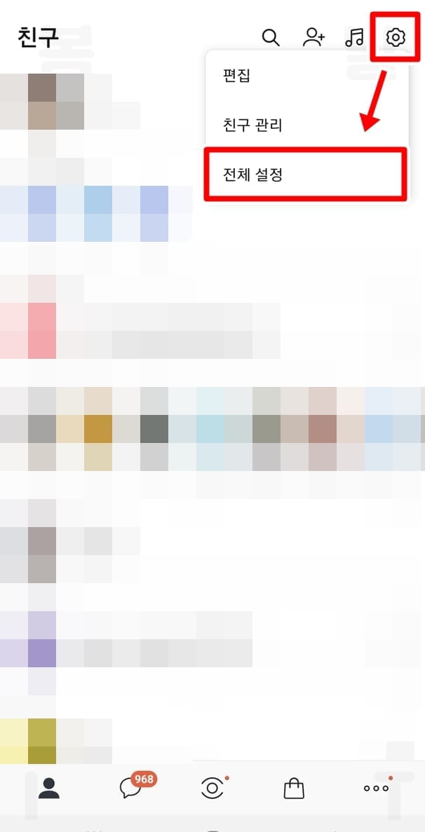 1. 카톡에서 톱니바퀴 버튼 > 전체설정을 클릭합니다.