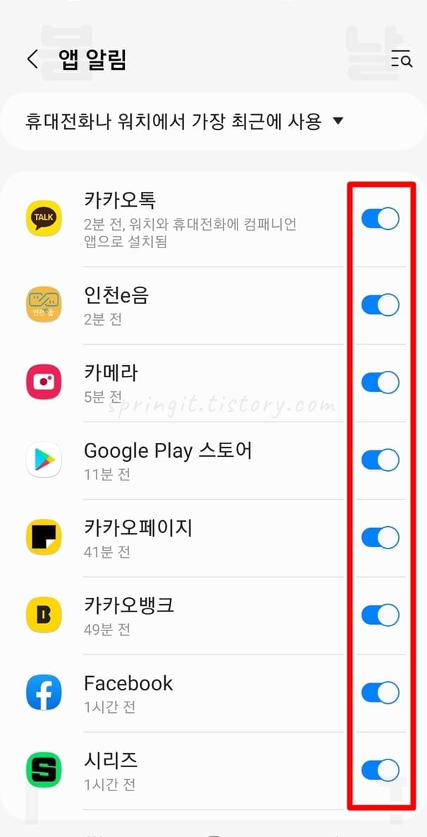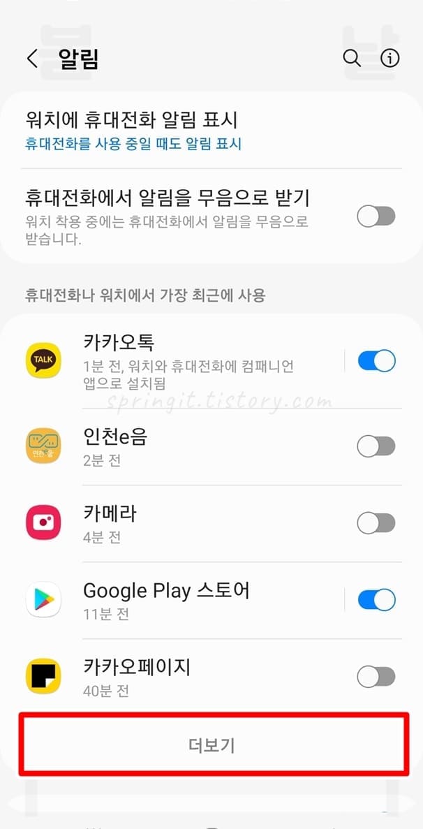 비활성화된 앱은 갤럭시 워치에서 알림되지 않으니 원하는 앱은 모두 켜주시면 됩니다.
