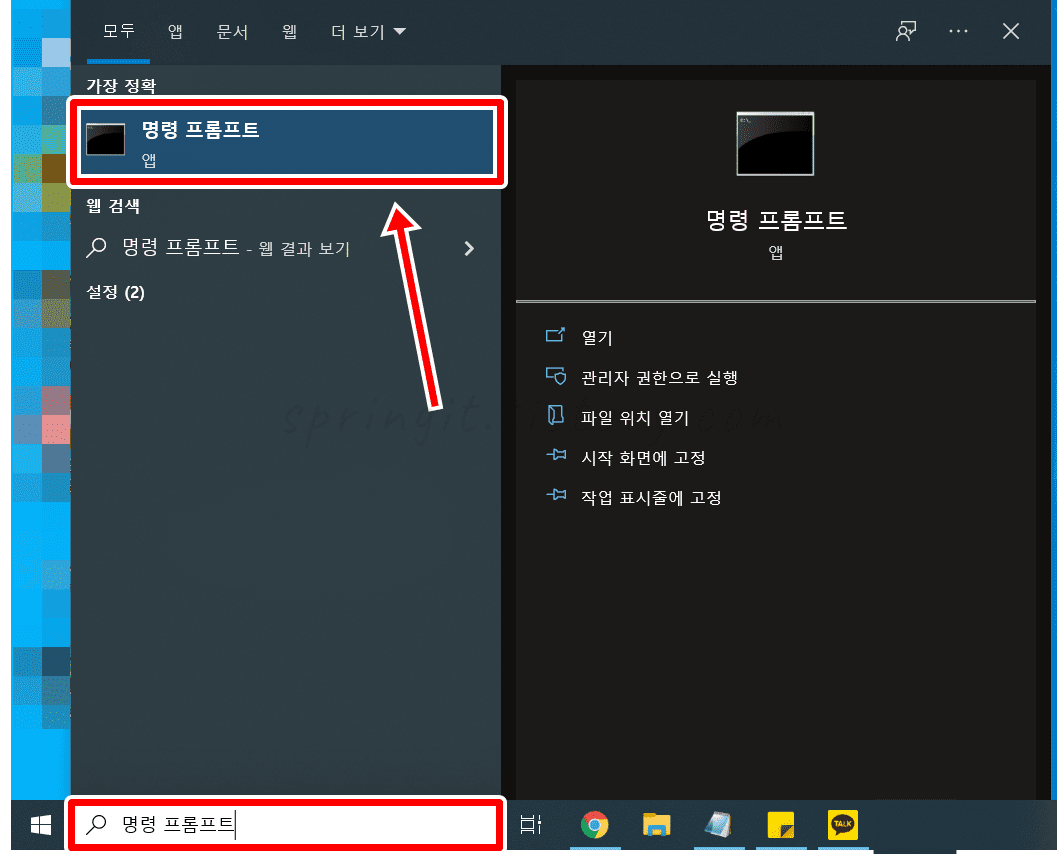 1 작업표시줄 검색창으로 명령 프롬프트를 실행합니다.