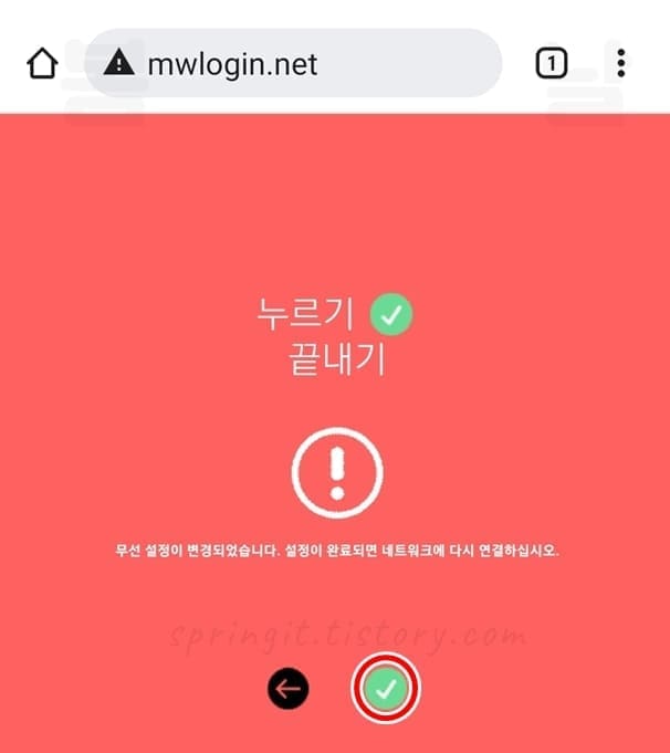 이렇게 이름과 비밀번호가 설정되면 곧바로 와이파이 연결이 끊기게 됩니다. 이제 다시 변경된 설정으로 와이파이를 연결해주도록 하겠습니다.