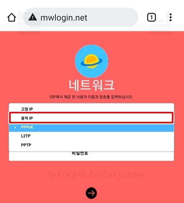 대한민국에서 사용되는 와이파이 유형은 동적 IP입니다. 만약 해외에서 사용하거나 별도로 원하시는 연결 유형이 있으시다면 다른 것을 선택해주셔도 됩니다. (한국에선 동적 IP 와이파이가 아니면 사용이 불가능 함!)