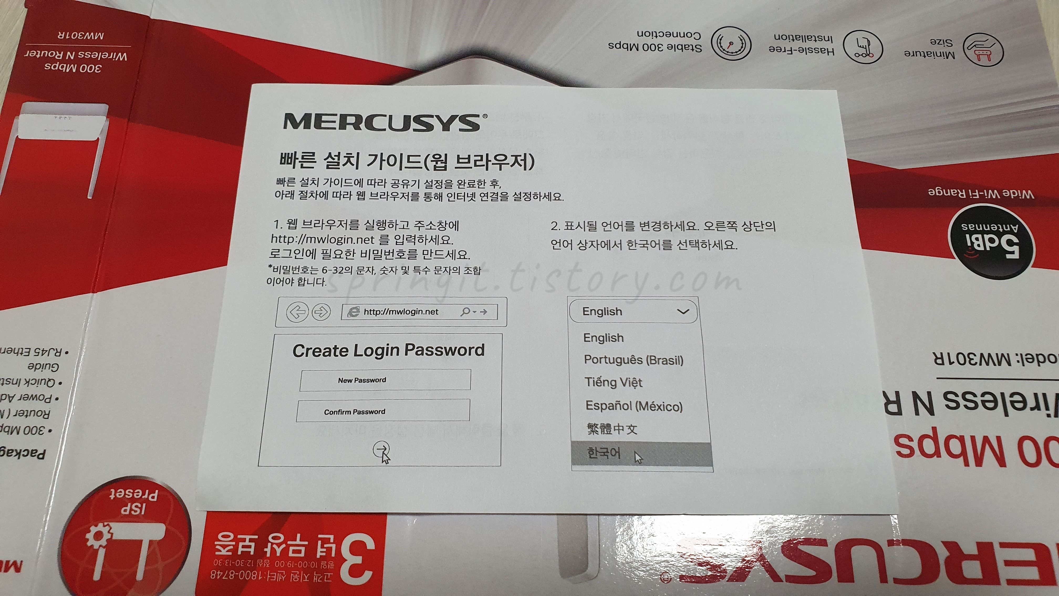 동봉된 설명서에서는 MERCUSYS 빠른 설치 가이드(웹브라우저)를 확인할 수 있었습니다. 이 설명서를 보면 Mercusys 사이트로 들어가서 와이파이 설정 및 비밀번호 걸기가 가능했는데요. 이 방법은 아래 본문에서 상세히 작성해보겠습니다.