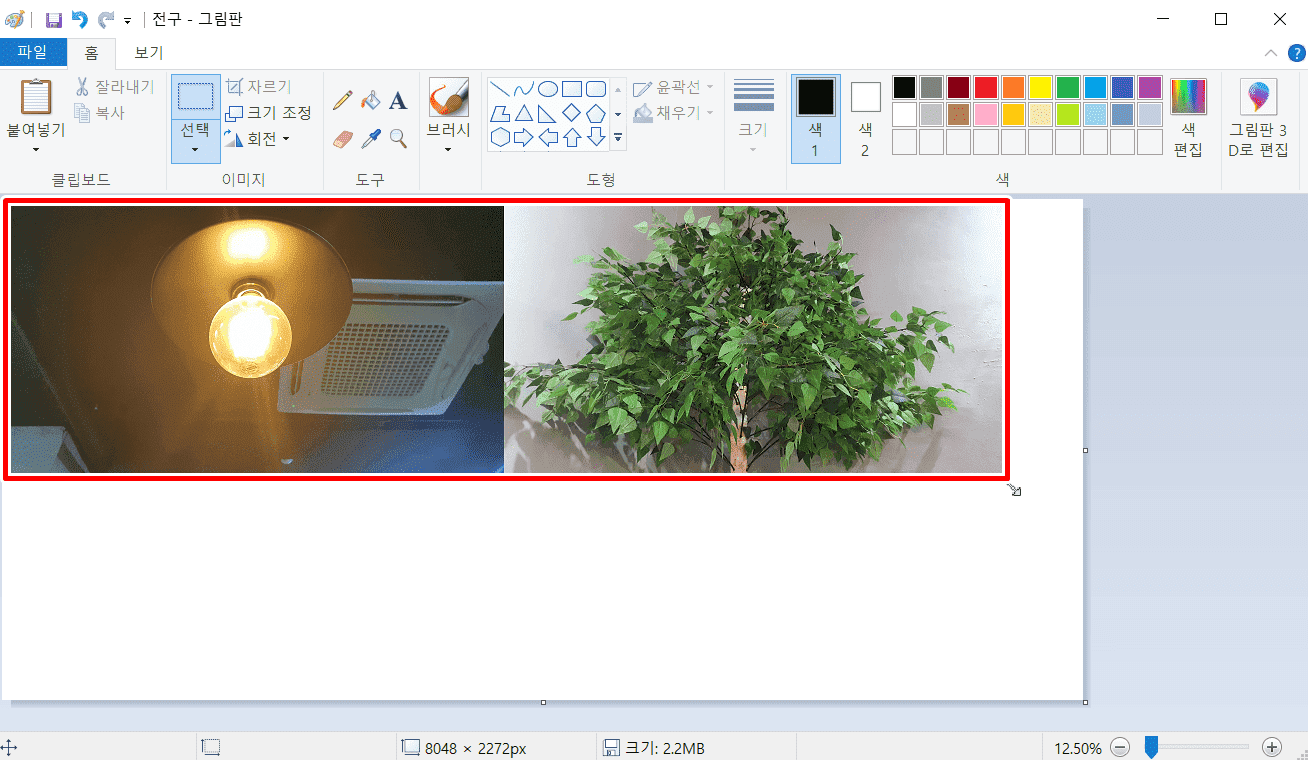 만약 그림판으로 여러장 사진을 하나로 합치고 싶으시다면 위 과정을 계속 반복해주시면 되겠습니다. 예를 들어서 위에서 확인한 2개의 사진을 한장으로 합쳐서 만들어진 결과물을 다시 전체선택 후 CTRL+C를 눌러 복사하여 3번째 사진을 불러온 그림판에 붙여넣기한다면 3장을 한장으로 만들 수 있겠죠.