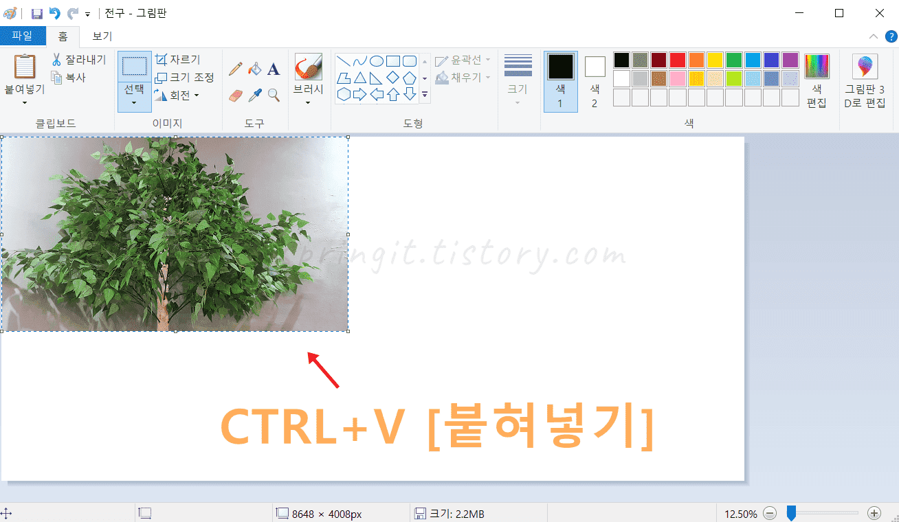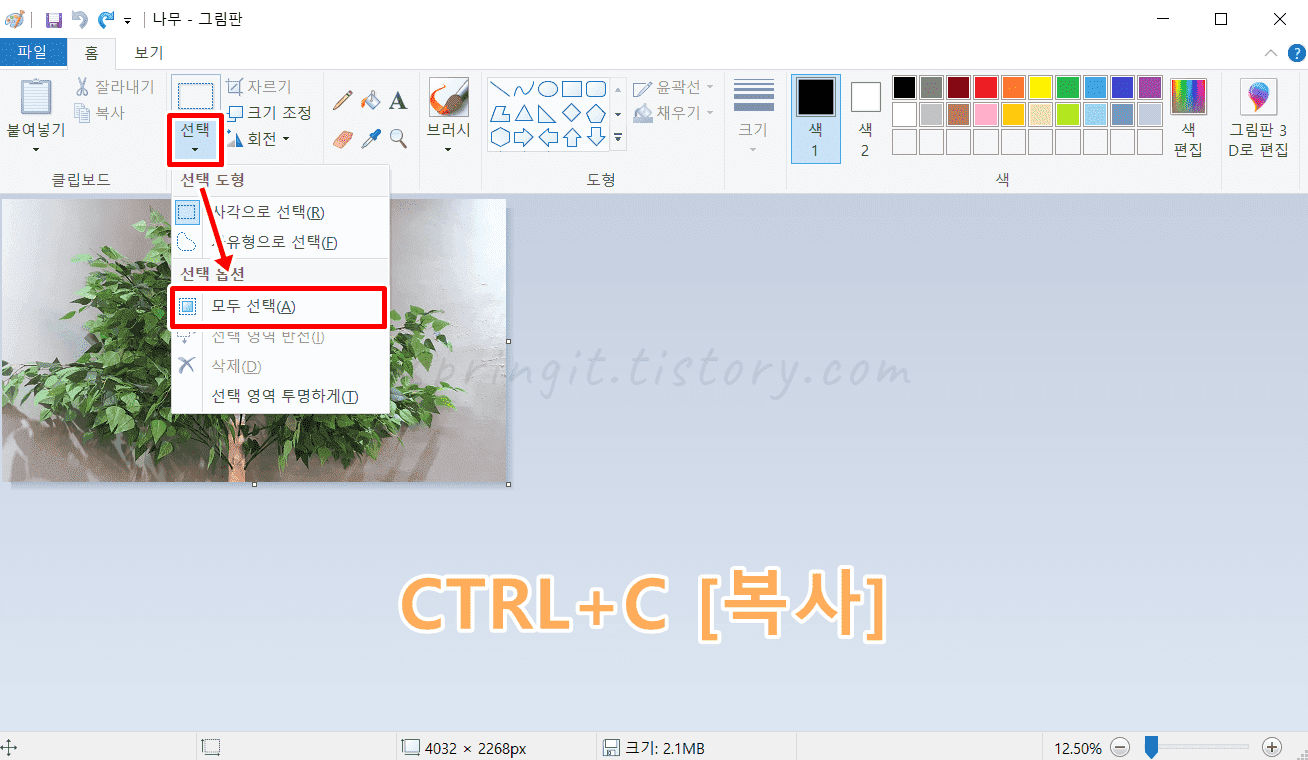 현재 그림판에 불러와진 사진을 복사해두는 절차입니다. 그래서 모두선택으로 범위를 지정해주셔야 하는데 버튼을 눌러서도 가능하지만 CTRL+A 단축키를 눌러서도 가능합니다. 복사는 CTRL+C이니 이어서 눌러주시면 되겠습니다.