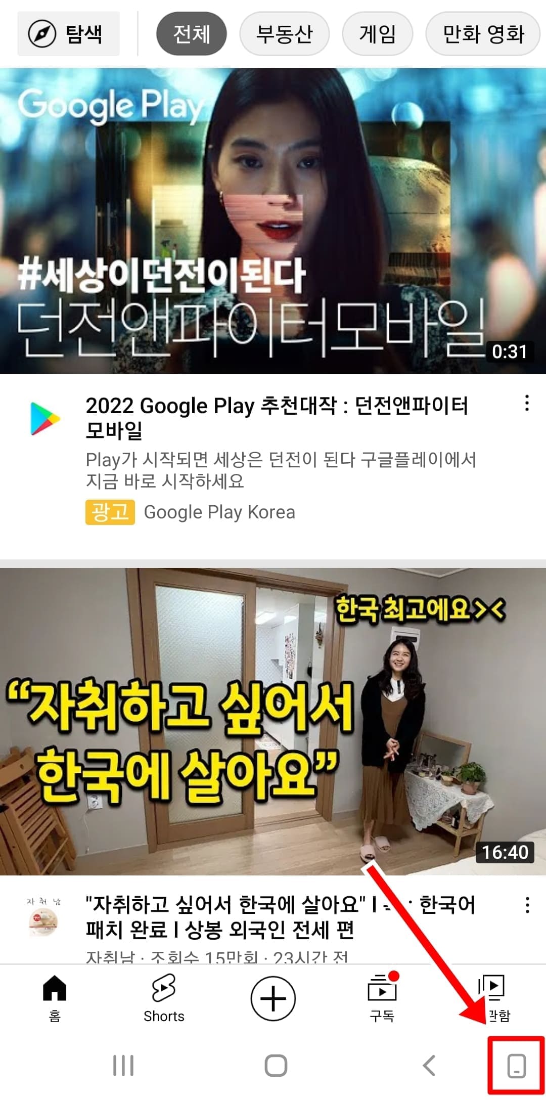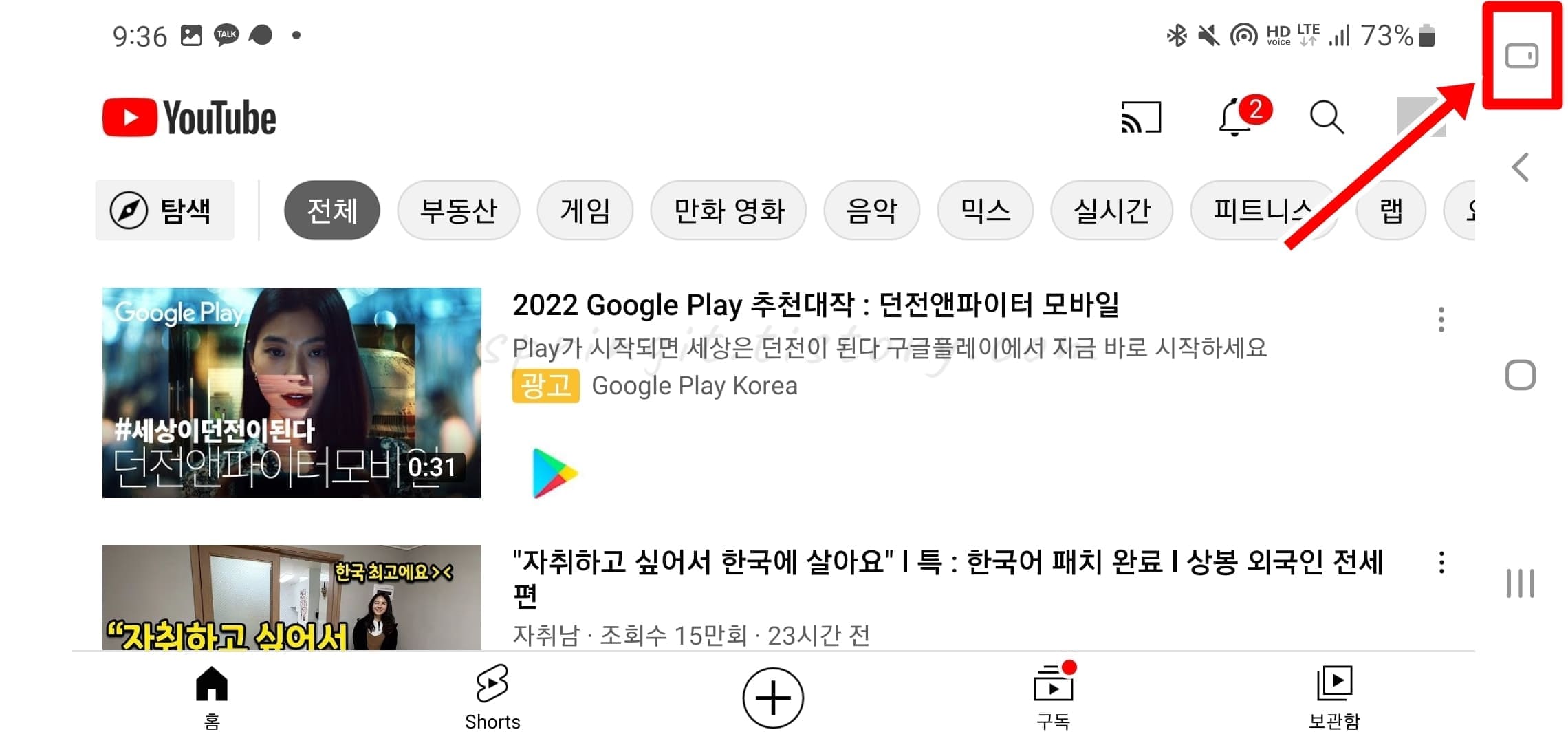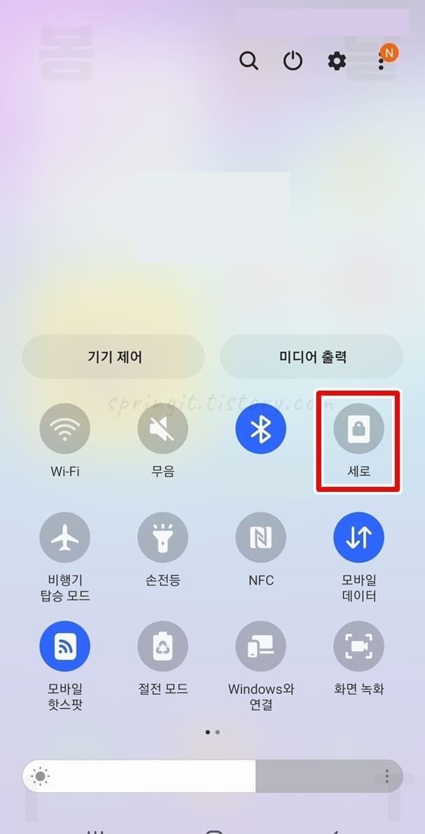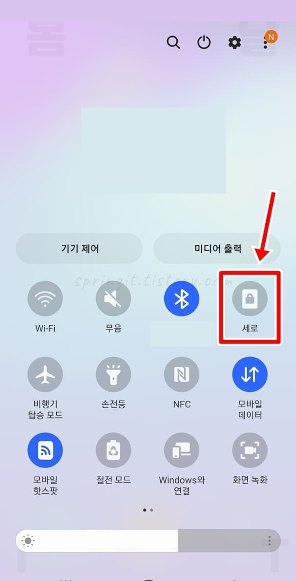 1. 상단바를 아래로 내려서 세로 버튼을 누릅니다.