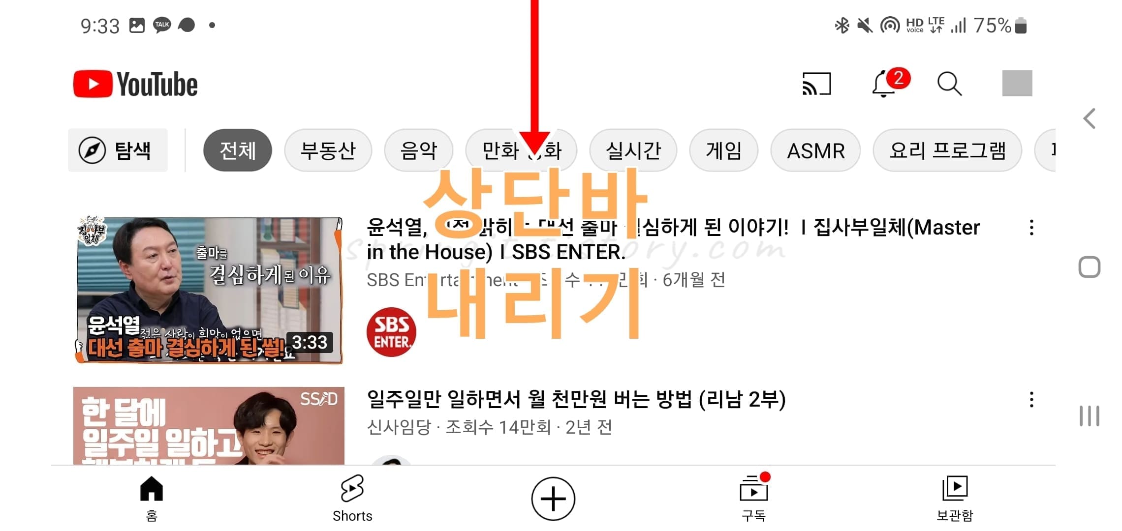 1. 갤럭시의 상단바를 아래로 내립니다.