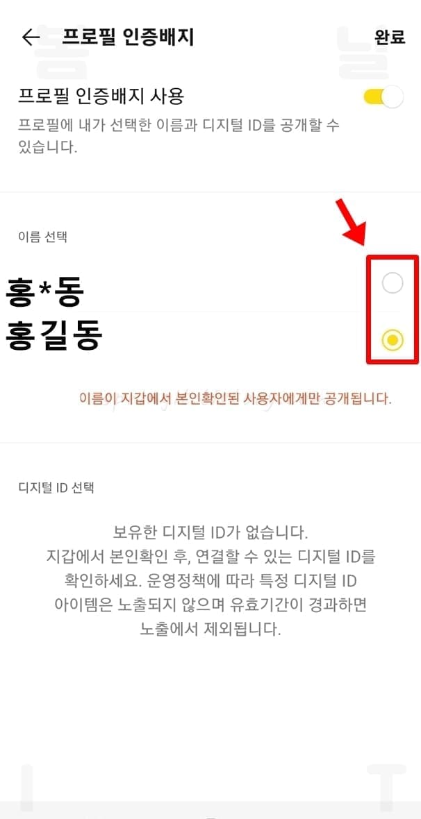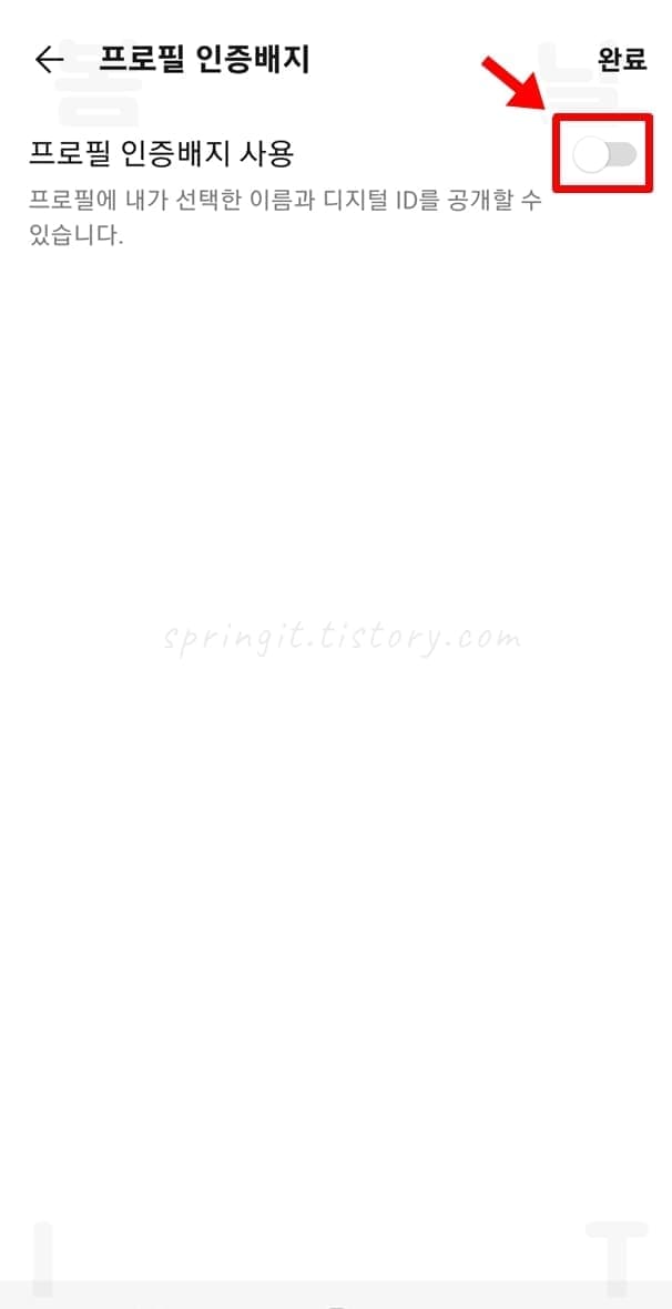 6. 프로필 인증배지 사용을 누릅니다.