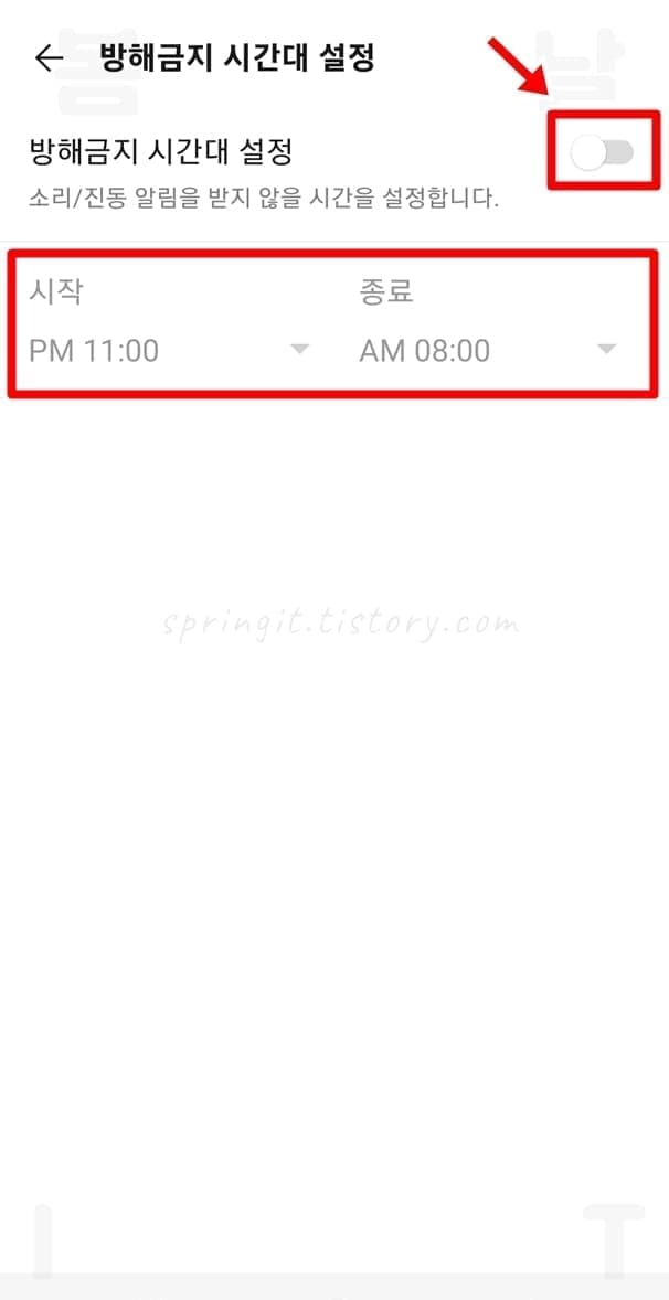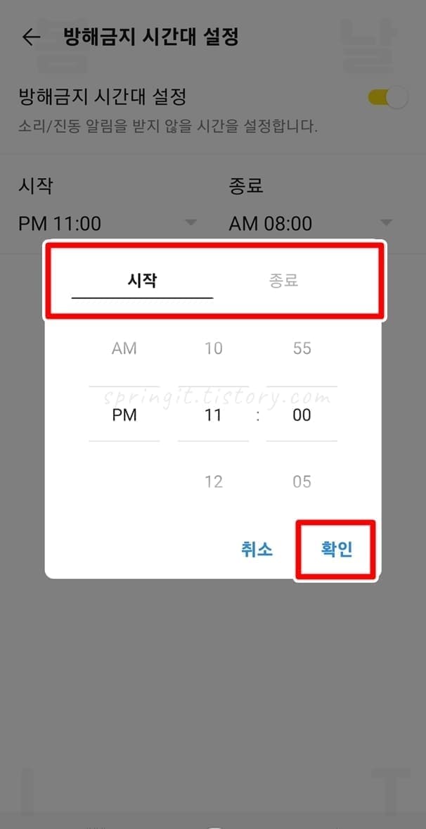 7. 보이스톡 알림을 받고 싶지 않은 시작시간과 종료시간을 설정합니다.