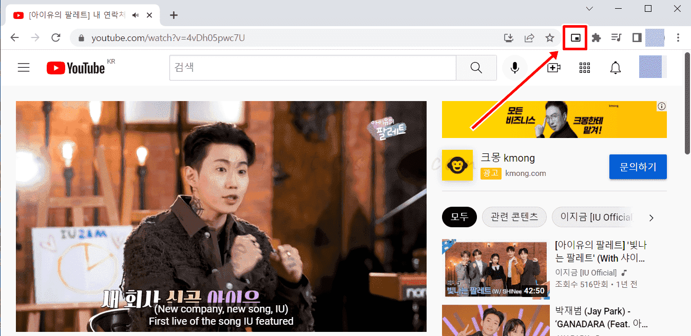 7. PC 유튜브 동영상에서 PIP 확장프로그램 버튼을 클릭합니다.