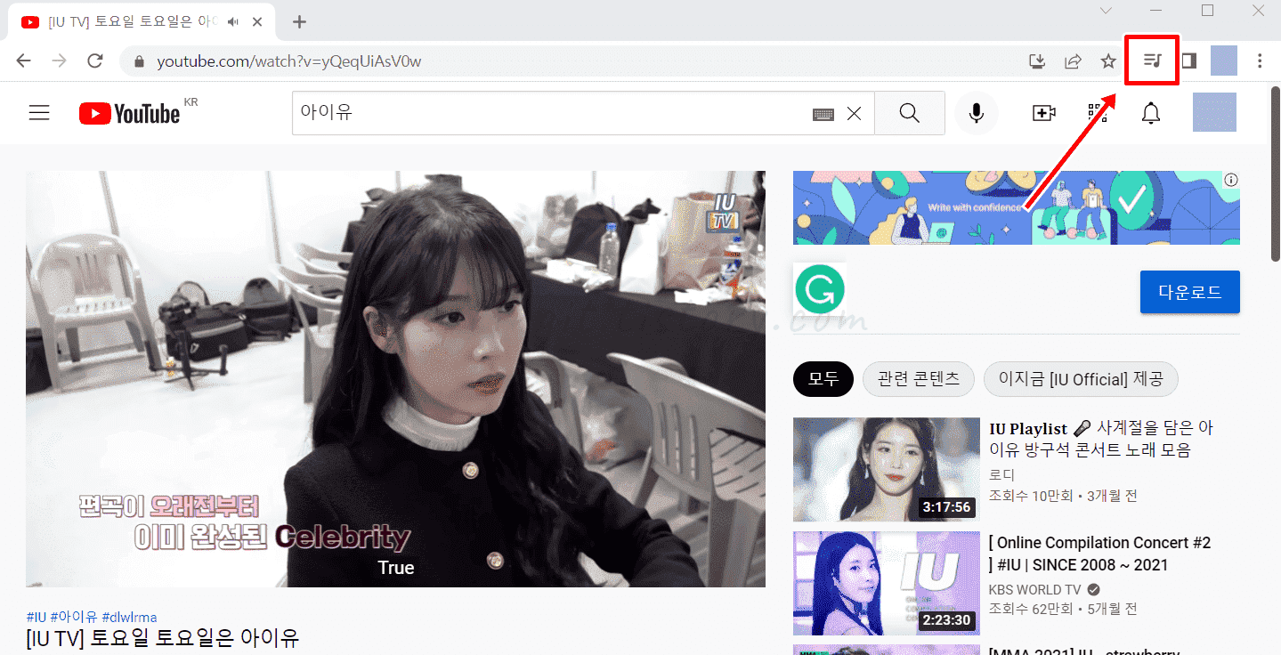 제어 버튼은 줄 3개 모양과 음표 모양으로 생겼습니다. 동영상을 재생해야지만 크롬 주소창 우측에 표시되니 찾으신 후 눌러주세요.