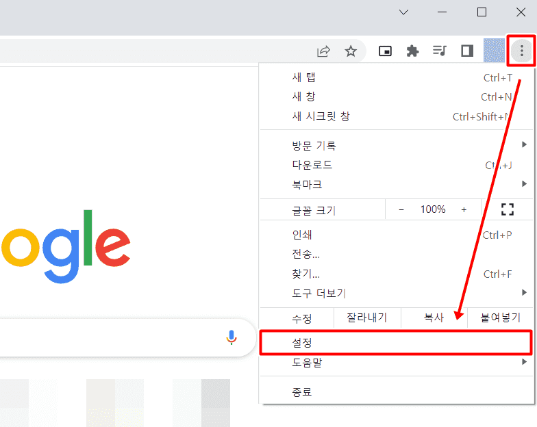 1. PC 크롬에서 더보기 버튼 > 설정을 클릭합니다.