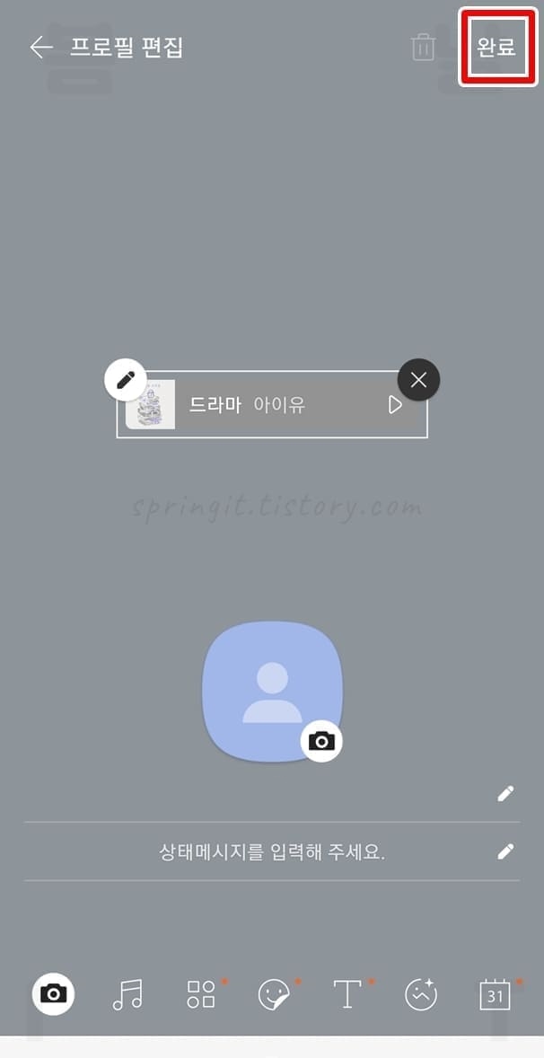 7. 프로필 뮤직 편집 페이지에서 완료를 누릅니다.