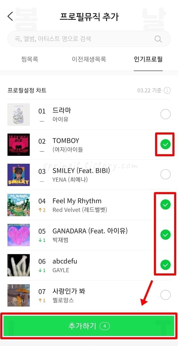 5. 카톡 프로필 음악으로 설정할 노래를 선택합니다.