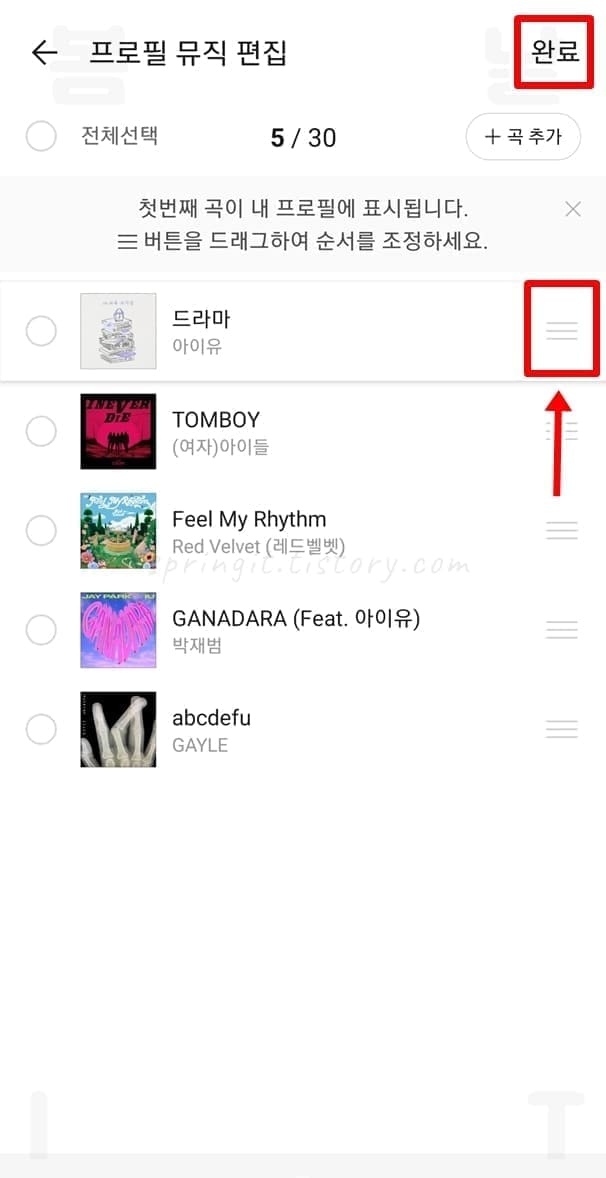 6. 내 프로필에 대표로 보여질 뮤직을 맨 위로 드래그합니다.