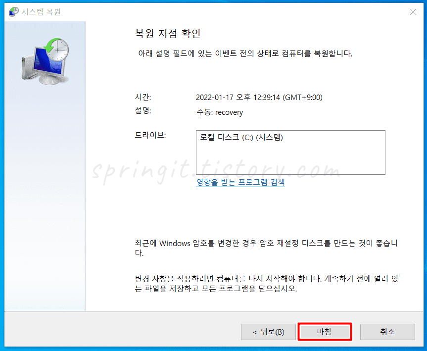6. 마침을 누르면 컴퓨터가 복원 지점으로 복구됩니다.