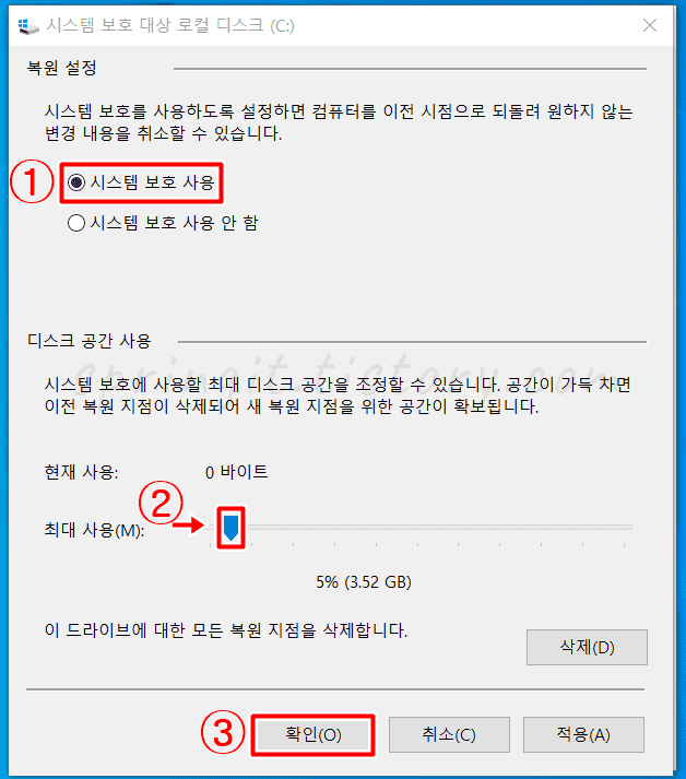 중요★- 윈도우10 복원지점 만들기시 백업 데이터를 계속 보관할 디스크 공간이 필요합니다. 그래서 컴퓨터의 용량중 몇%를 할당해서 사용하겠느냐가 중요한 요점입니다. 보통 3%~5%를 이용하는데 현재 컴퓨터 백업 데이터가 클 경우 할당된 디스크 공간이 가득차게 되어 이전 복원 지점이 삭제될 수도 있습니다. 그래서 넉넉히 5%로 설정하시는 추천드립니다.