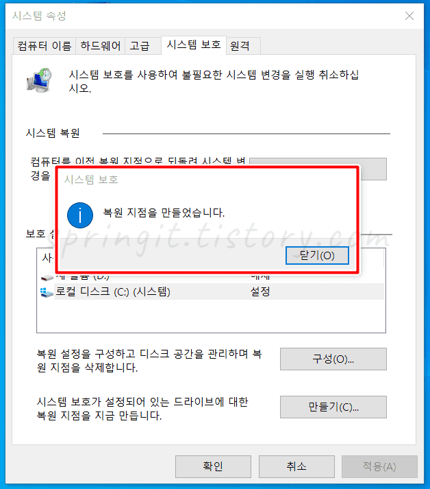 13. 현재 시점으로 시스템 복원 지점이 만들어졌습니다.