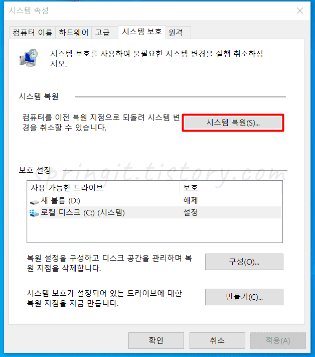 4. 보호 설정에서 시스템이 설치된 드라이브를 누릅니다.
