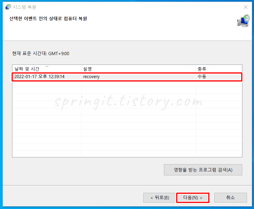 4. 목록에서 되돌리고 싶은 백업 시점을 선택합니다.