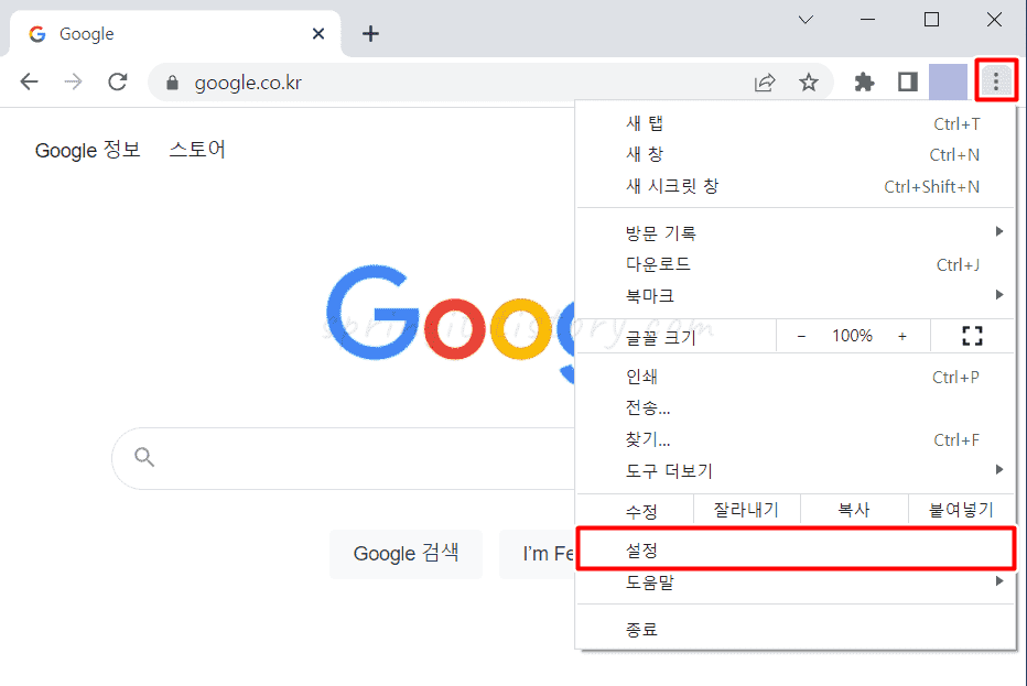 1. 크롬에서 더보기 버튼을 누르고 설정을 클릭합니다.