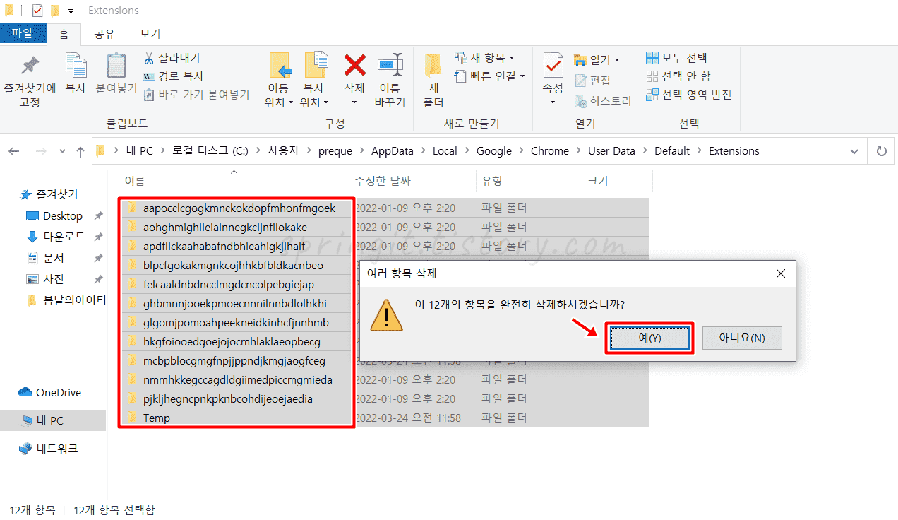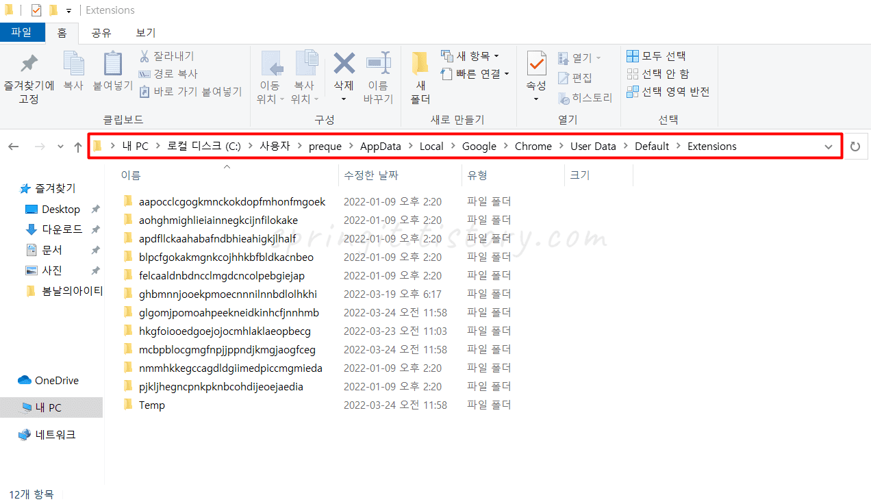 크롬 확장프로그램 설치 폴더 위치 경로: 내 PC > 로컬 디스크 (C) > 사용자 > 사용자이름 > AppData > Local > Google > Chrome > Use Data > Defalult > Extensions