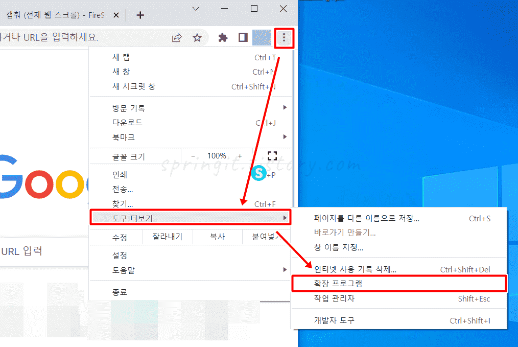 2. 도구 더보기에서 확장 프로그램을 누릅니다.